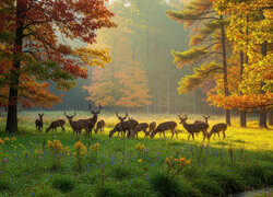 Sarny i jelenie pod jesiennymi drzewami na polanie