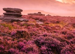 Skała na wrzosowisku w Parku Narodowym Peak District w Anglii