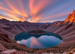 Skalna wysepka na górskim jeziorze pod kolorowym niebem