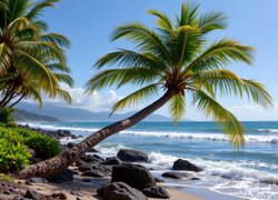 Skały i pochylona palma nad morzem