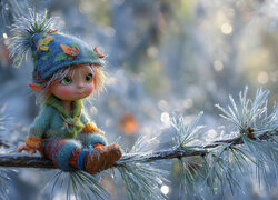 Skrzat w kolorowym ubranku i czapce siedzący na sosnowej gałązce