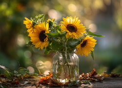Słoneczniki ozdobne w słoiku na jesiennych liściach