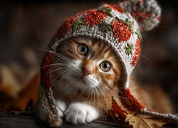 Spojrzenie biało-rudego kotka w wełnianej czapce