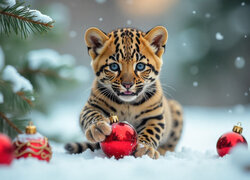 Spojrzenie małego lamparta z czerwoną bombką na śniegu