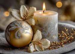 Stroik z zapaloną świecą i kwiatami oraz złotą bombką