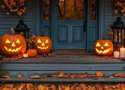 Świecąca dynia i zapalone latarnie oraz świece przed drzwiami do domu