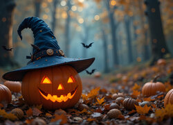 Świecąca dynia w czarnym kapeluszu na opadłych liściach