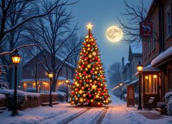 Udekorowana choinka na zaśnieżonej ulicy w księżycowym blasku