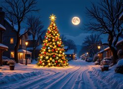 Udekorowana choinka przy zaśnieżonej drodze w księżycowym blasku