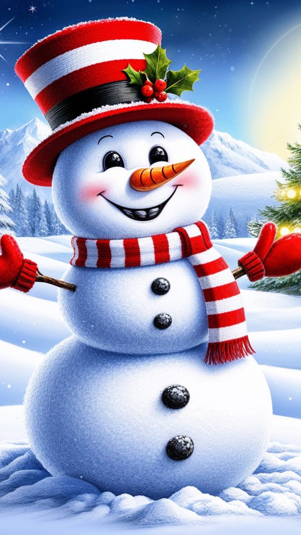 Uśmiechnięty bałwanek w biało-czerwonym kapeluszu i szaliku