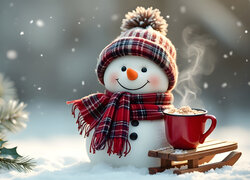 Uśmiechnięty bałwanek w czapce i szaliku obok sanek