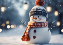 Uśmiechnięty bałwanek w ośnieżonej czapce i szaliku