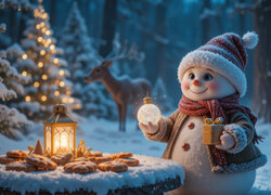 Uśmiechnięty bałwanek w zimowym ubranku z prezentem i świecącą kulą