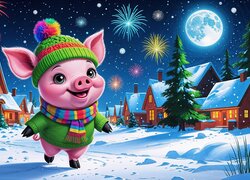 Wesoła świnka w czapce i szaliku na tle fajerwerków i domów