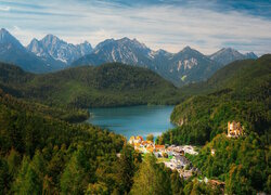 Widok na zamek Hohenschwangau i jezioro w Alpach Bawarskich
