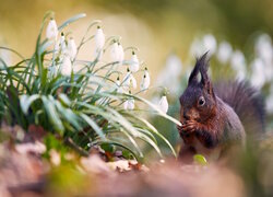 Wiewiórka obok przebiśniegów na rozmytym tle