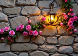 Zapalona lampa i pnące róże na ścianie z kamienia