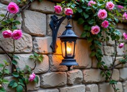 Zapalona lampa i różowe pnące róże na kamiennej ścianie