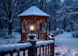 Zapalona lampa na ośnieżonym ogrodzeniu obok altany w zimowym parku