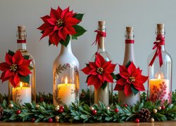 Zapalona świeca i kwiaty gwiazdy betlejemskiej w dwóch butelkach