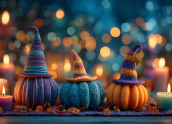 Zapalona świeca obok pomarańczowej dyni z wełny w czapce