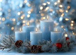 Zapalone niebieskie świece obok gałązek i bombki oraz szyszek