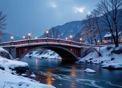 Zapalone o zmierzchu latarnie na ośnieżonym moście