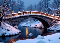 Zapalone o zmierzchu latarnie na ośnieżonym moście