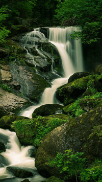 Omszałe skały i zielone drzewa przy wodospadzie
