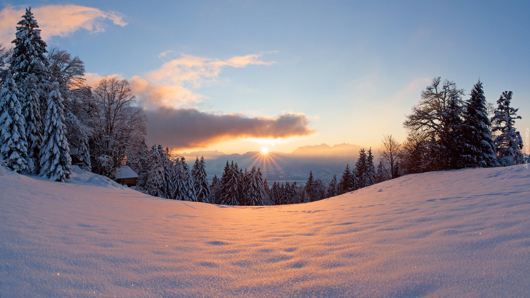 Tagi: Zima, Zachód słońca, Drewniany, Domek, Drzewa