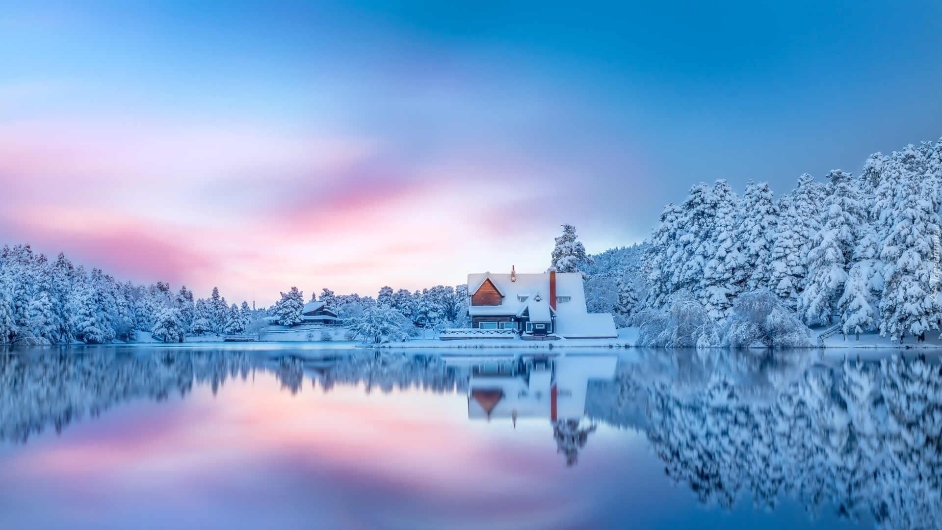Ośnieżone drzewa i domy nad jeziorem
