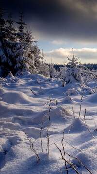 Ośnieżone drzewa i krzewy pod ciemnymi chmurami