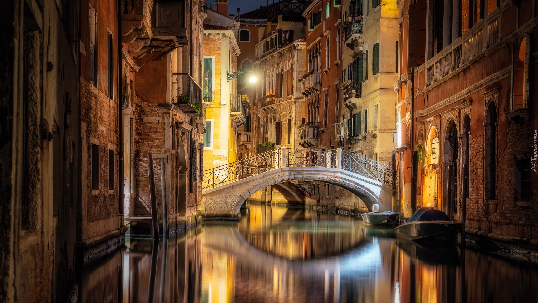 Tagi: Włochy, Wenecja, Kanał, Łódki, Domy, Most, Światło, Noc
