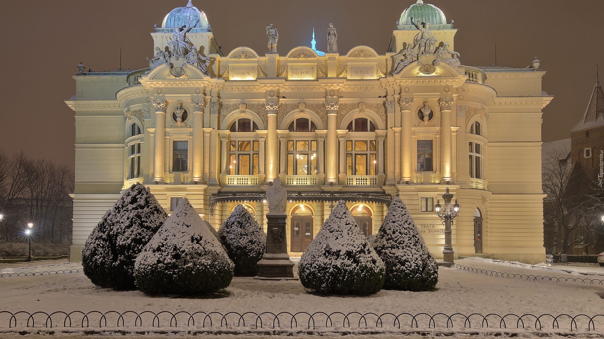 Tagi: Zima, Światła, Latarnie, Drzewa, Ośnieżone, Klomby, Pomnik, Teatr im Juliusza Słowackiego, Kraków, Polska