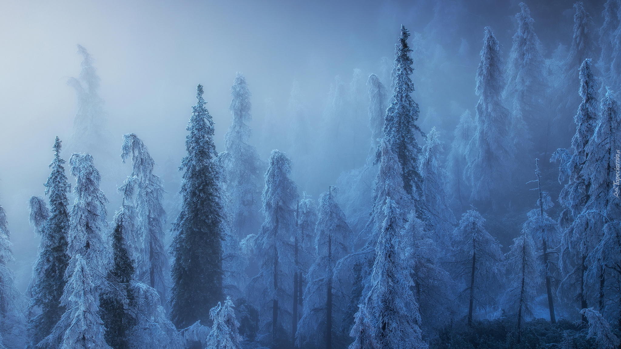 Tagi: Zima, Las, Ośnieżone, Oszronione, Drzewa, Mgła