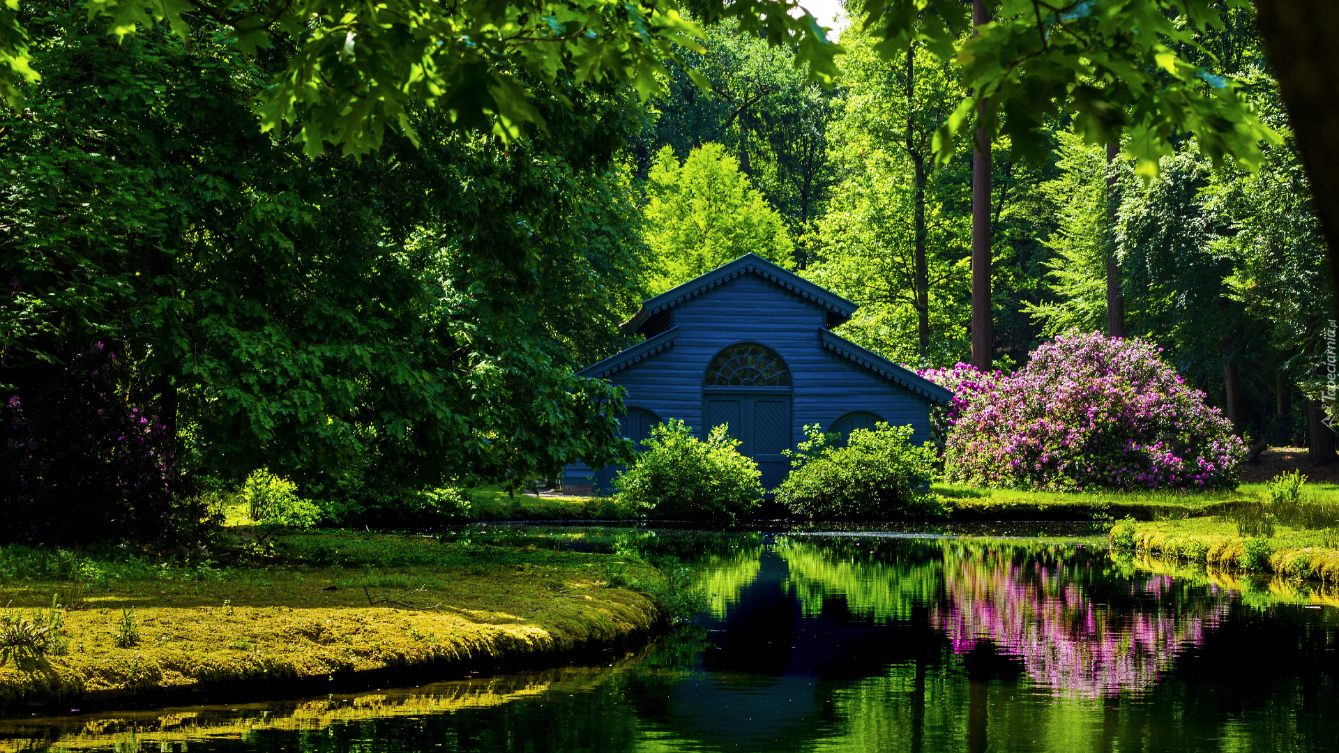 Staw, Park, Paleispark Het Loo, Drzewa, Różanecznik, Pawilon, Budowla, Apeldoorn, Holandia