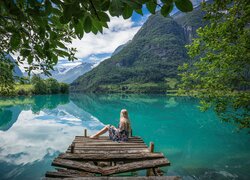 Jezioro, Pomost, Żaglówki, Wschód słońca, Chmury