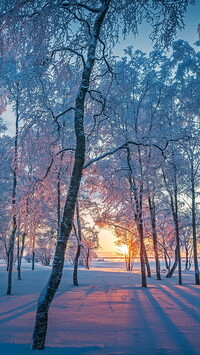 Tagi: Zima, Ośnieżone, Wysokie, Drzewa, Wschód słońca