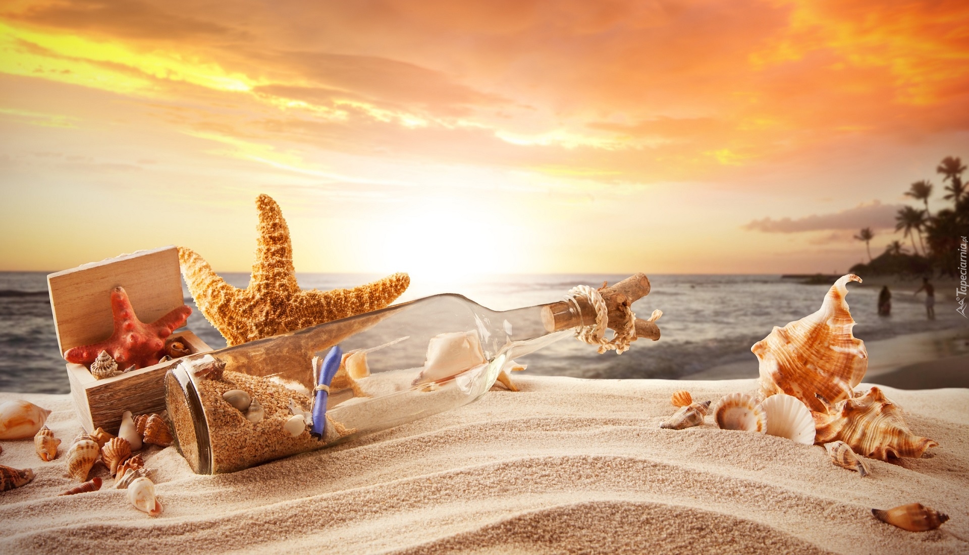 Tagi: Zachód słońca, Morze, Plaża, Muszelki, Butelka, Rozgwiazdy