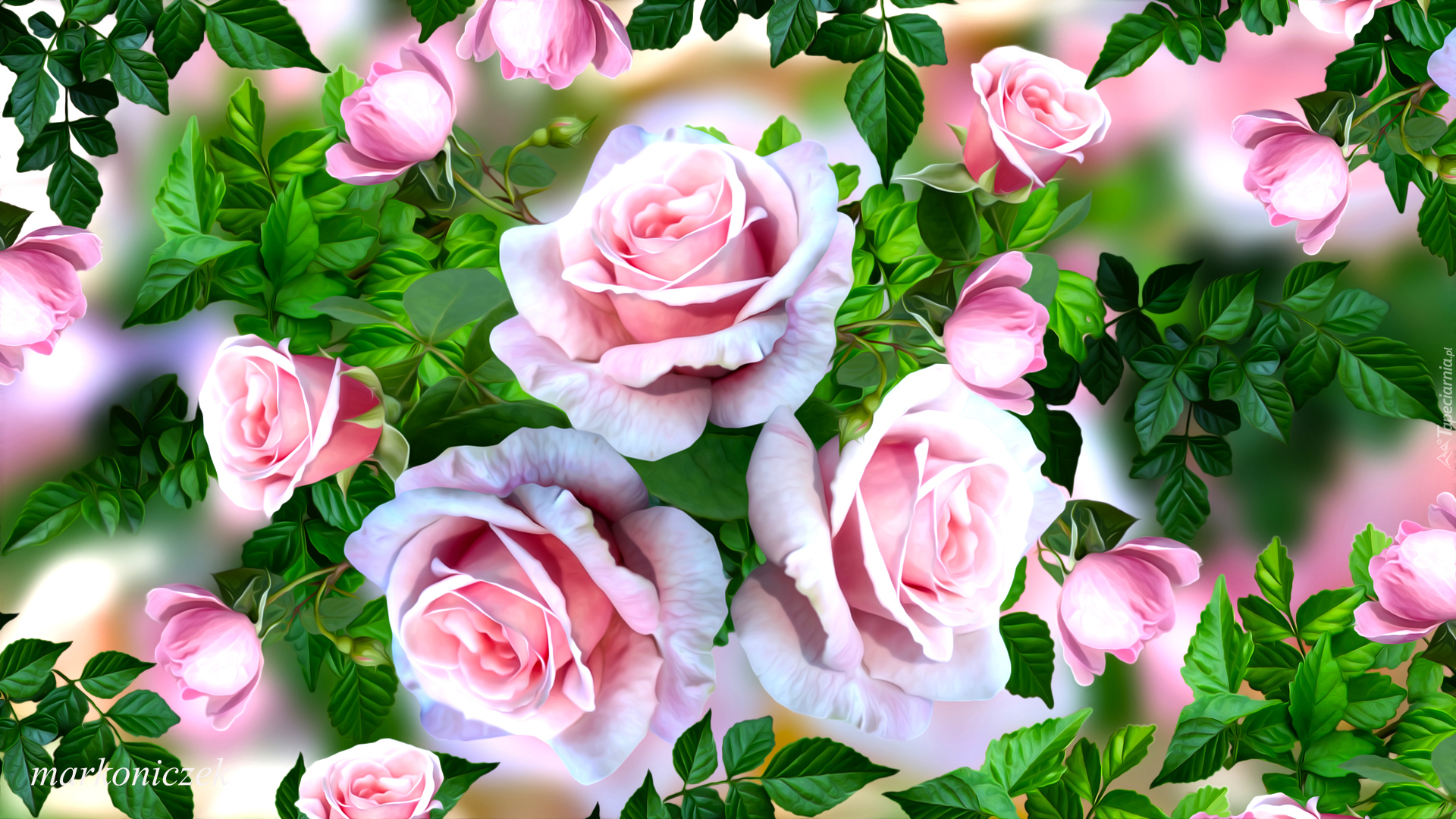 Tagi: Kwiaty, Różowe, Rozwinięte, Róże, Listki, Grafika