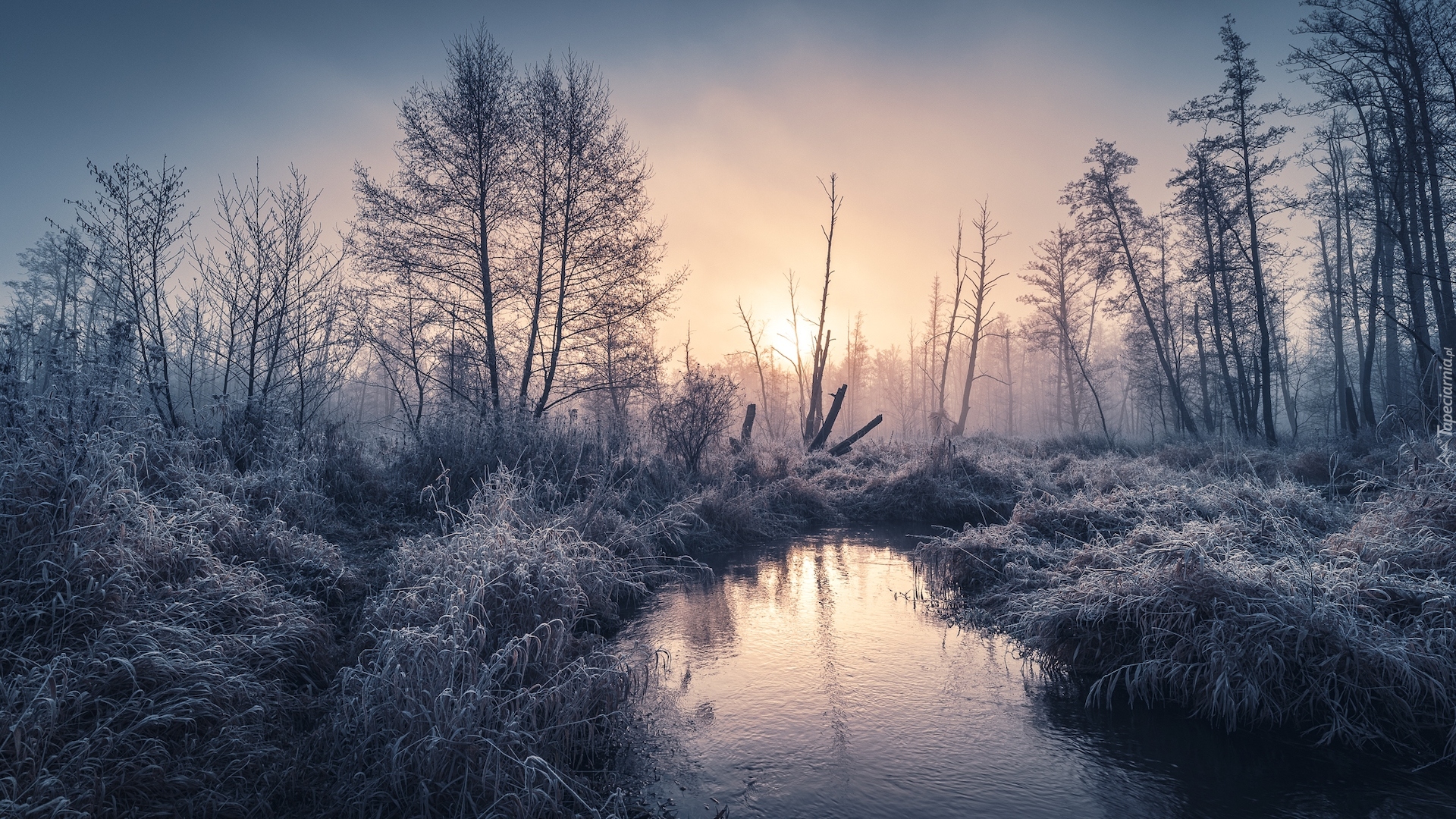 Tagi: Wschód słońca, Rzeka, Zima, Oszronione, Drzewa