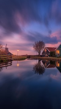 Skansen Zaanse Schans w Zaandam o zmierzchu