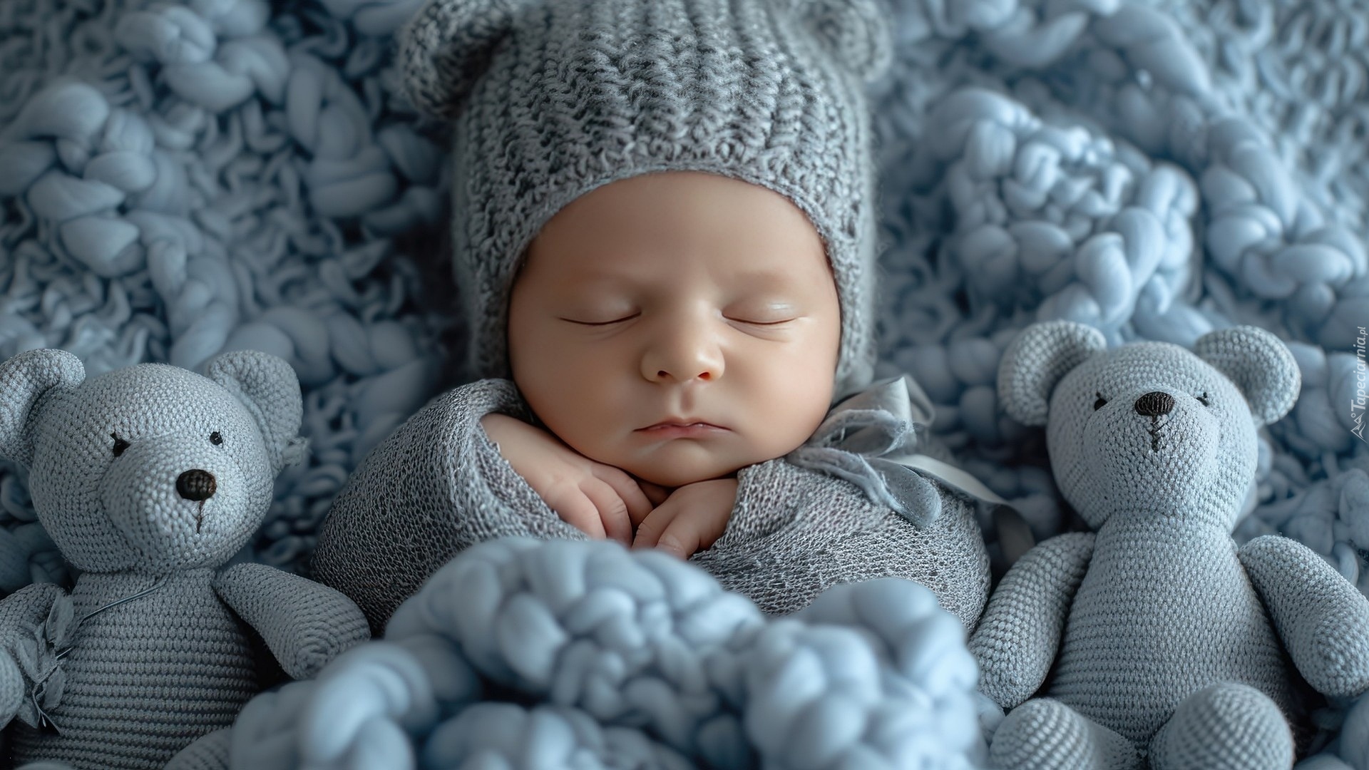 Śpiące niemowlę i dwa misie na kocu w niebieskiej tonacji