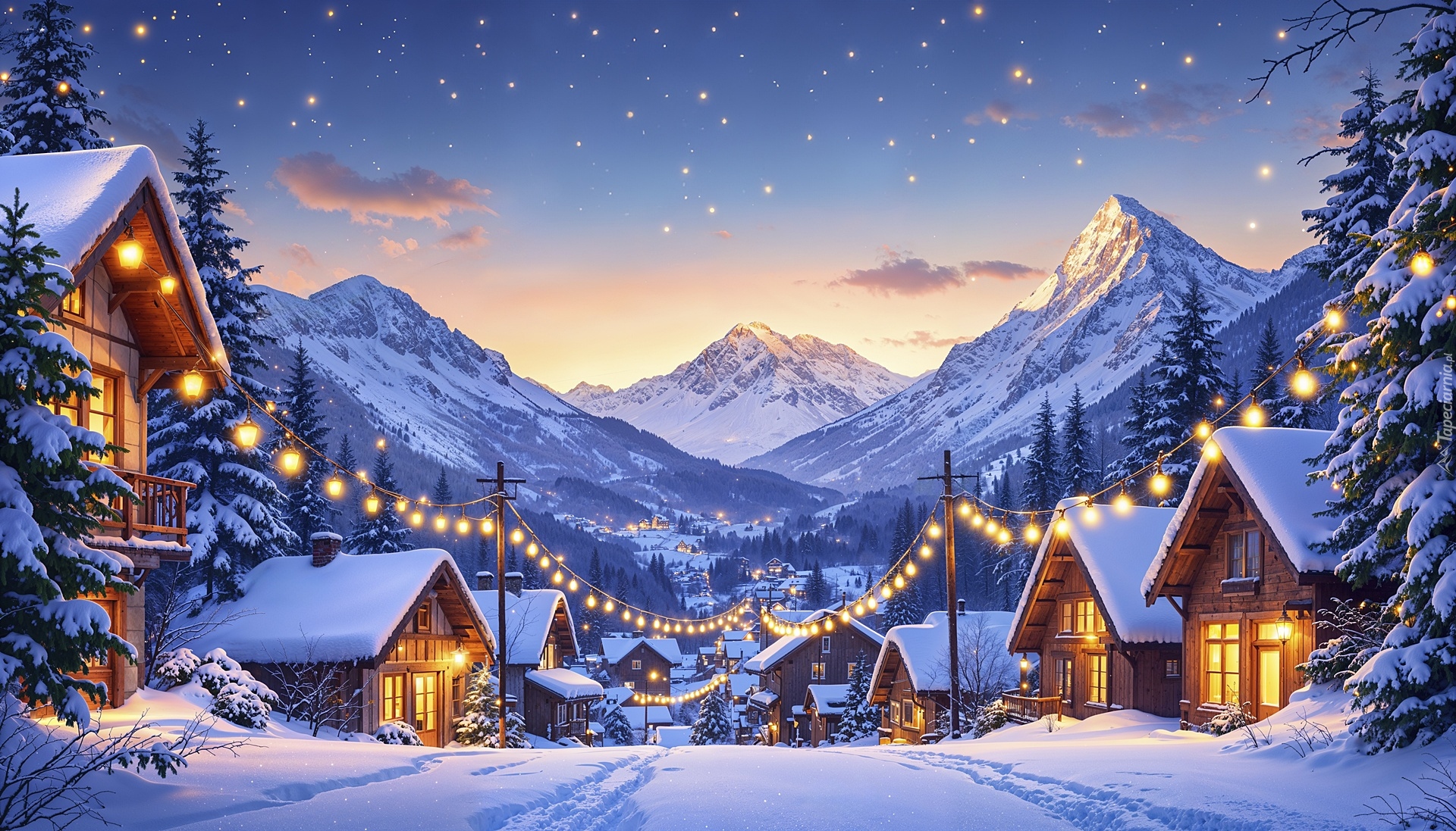 Światełka nad ośnieżonymi domami i ulicą w górskim miasteczku
