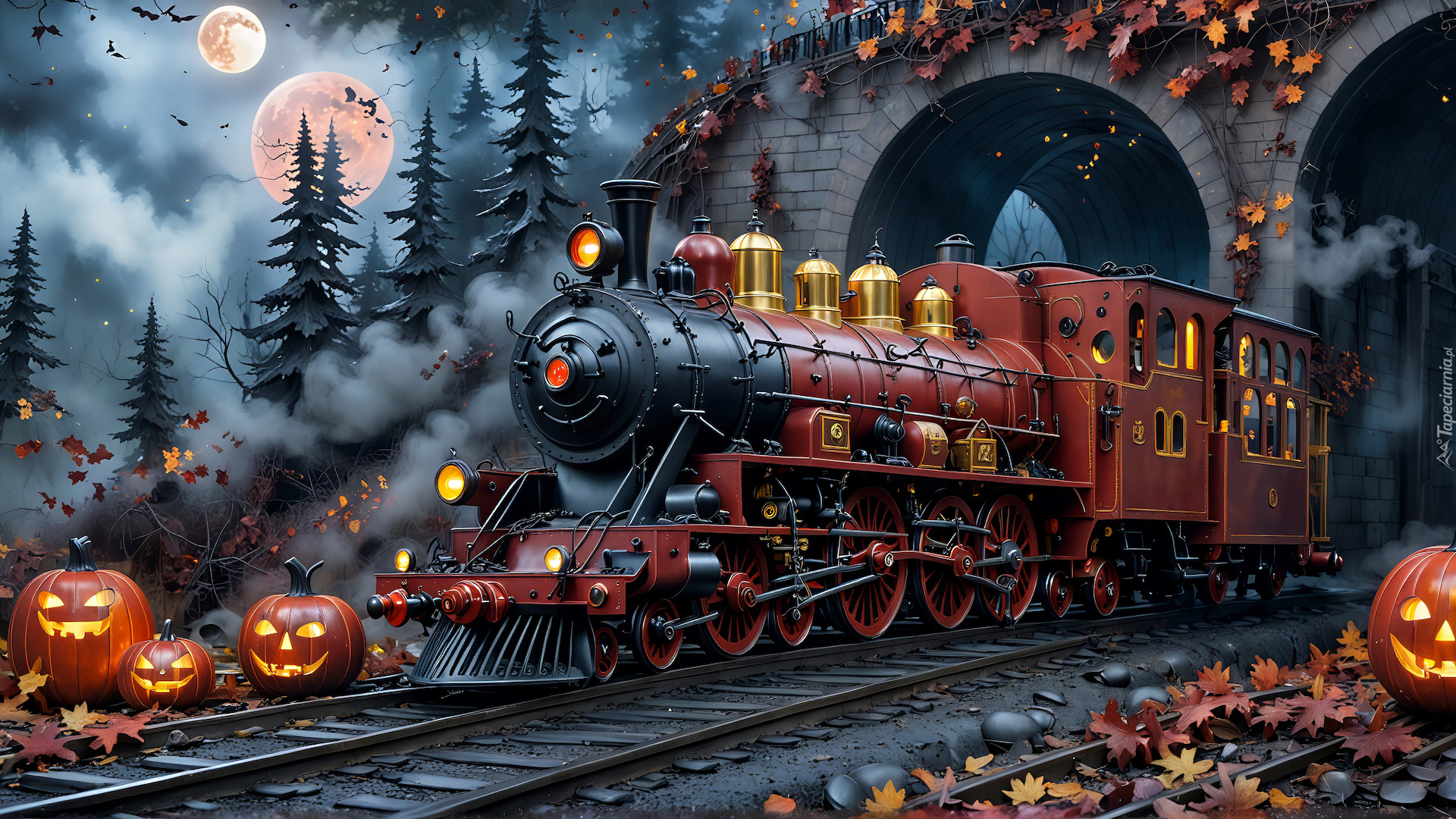 Tagi: Grafika, Pociąg, Lokomotywa, Most, Drzewa, Dynie, Grafika