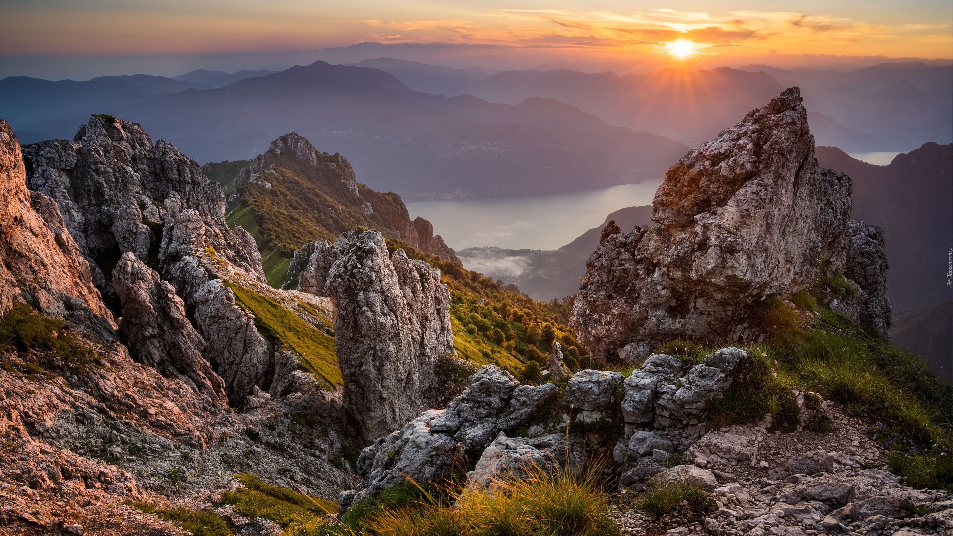 Tagi: Góry, Skały, Drzewa, Mgła, Trawa, Chmury, Zachód słońca