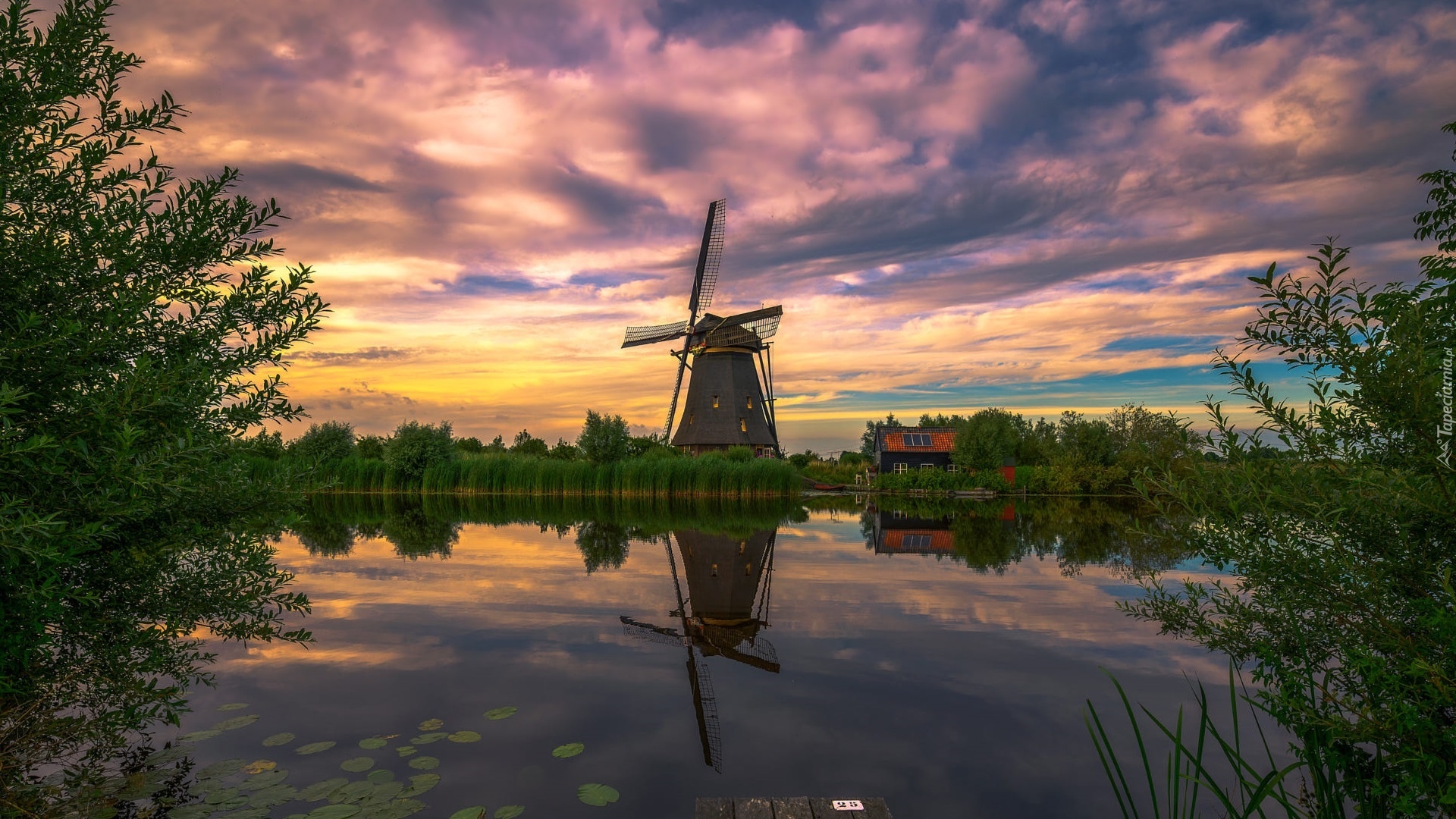 Tagi: Zachód słońca, Wiatrak, Dom, Rzeka, Kanał, Kinderdijk, Holandia