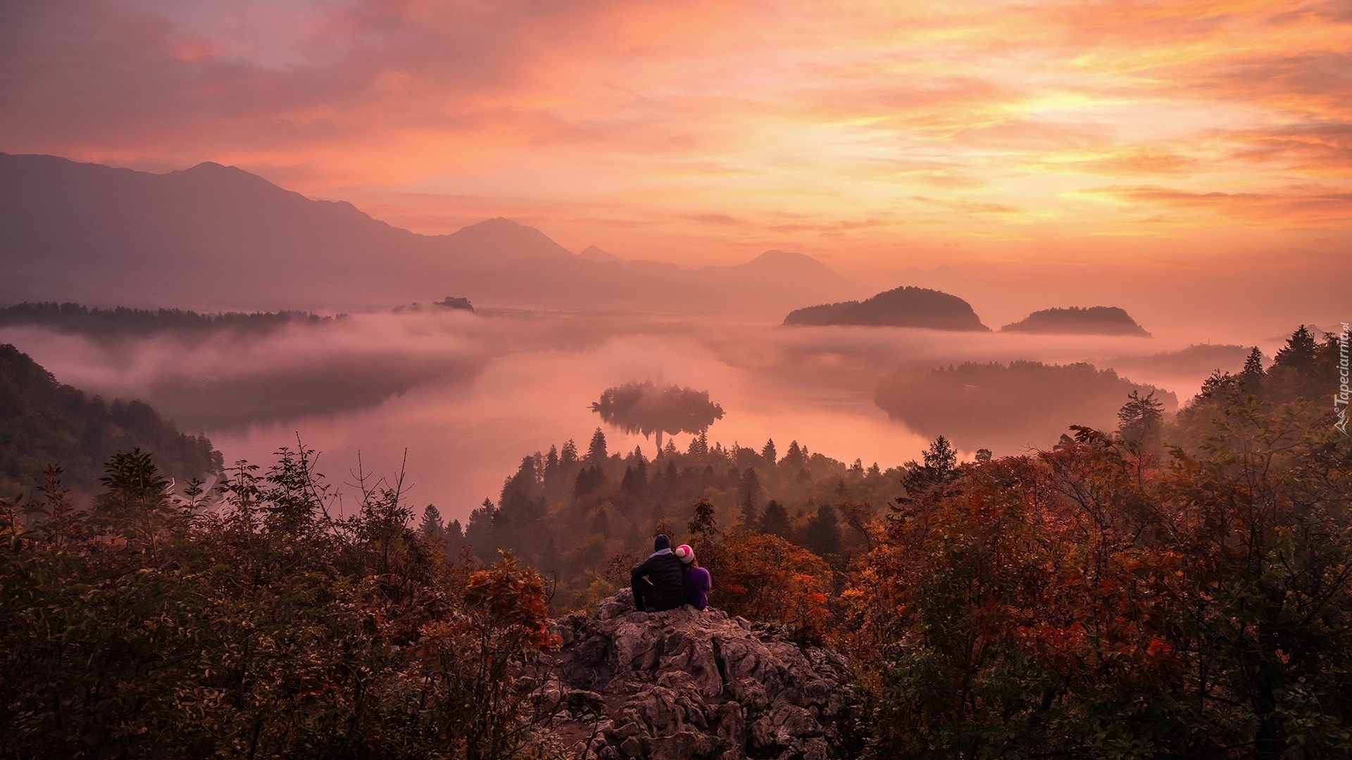 Tagi: Słowenia, Jezioro Bled, Wyspa Blejski Otok, Kościół, Góry Alpy Julijskie, Wschód słońca, Chmury, Mgła, Ludzie, Jesień