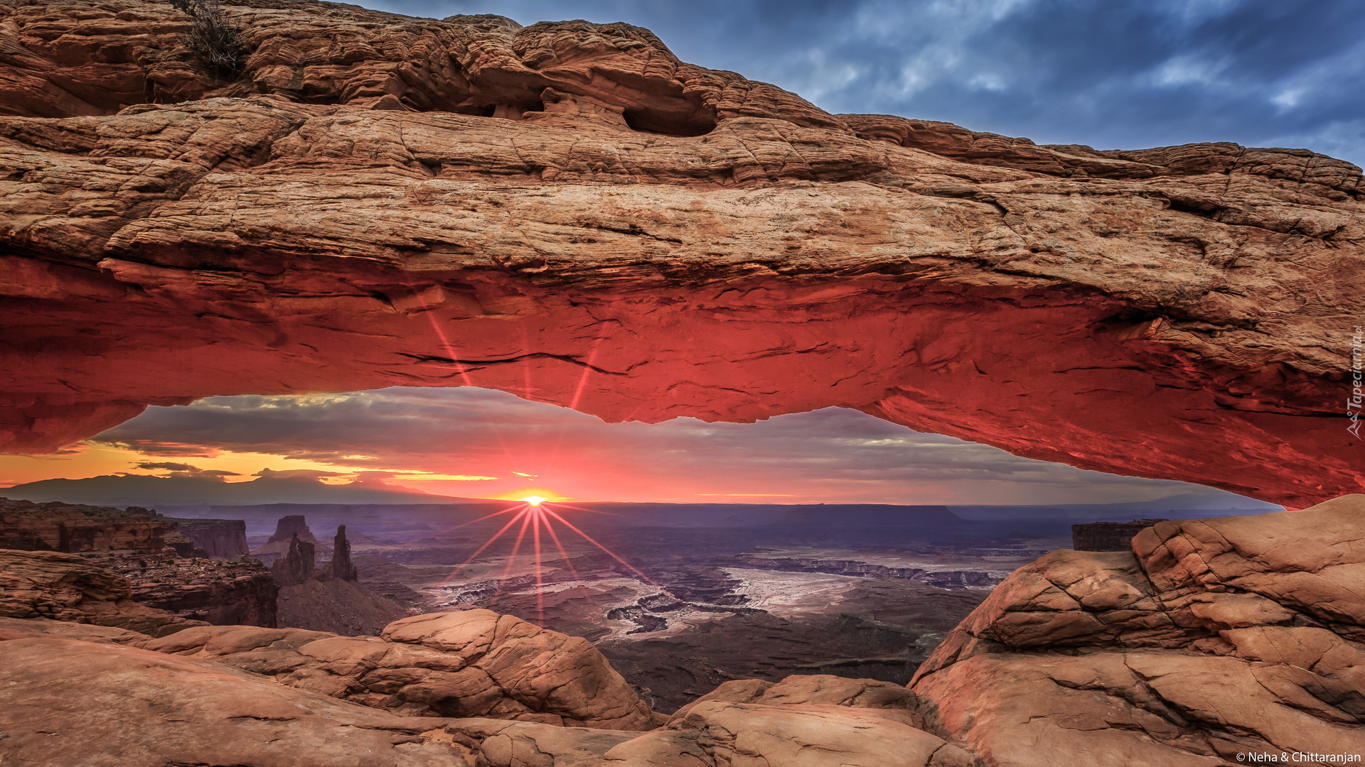 Tagi: Park Narodowy Canyonlands, Łuk Mesa Arch, Skały, Promienie słońca, Utah, Stany Zjednoczone