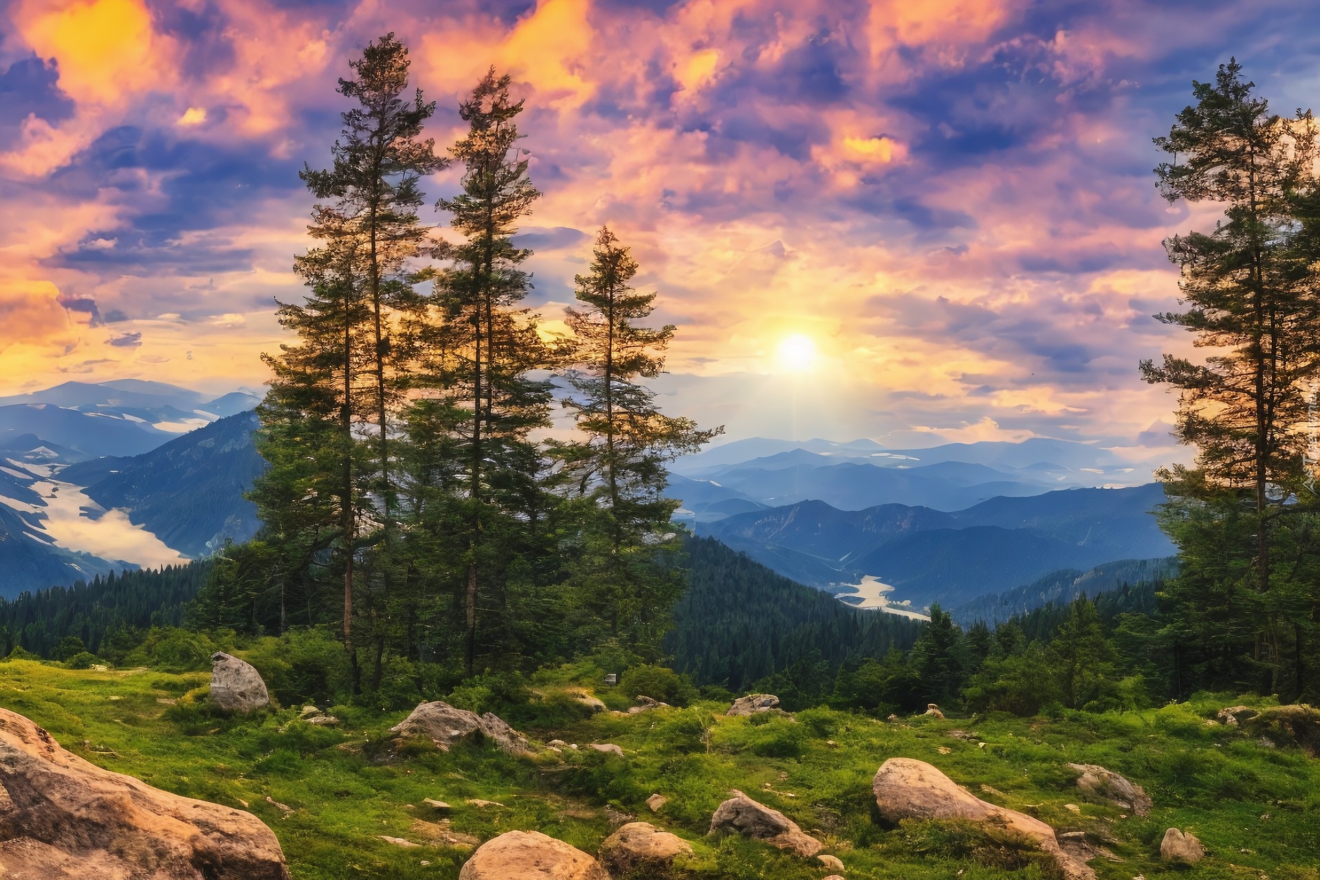 Tagi: Drzewa, Wzgórze, Zachód słońca, Góry, Dolina
